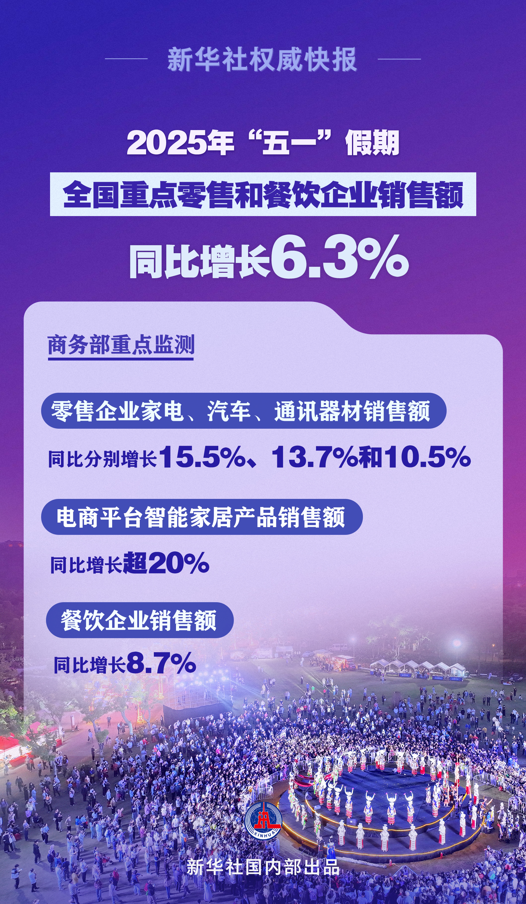 记者5月5日从商务部获悉,2025年“五一”假期,全国消费市场繁荣活跃。据商务部商务大数据监测,假期全国重点零售和餐饮企业销售额同比增长6.3%。